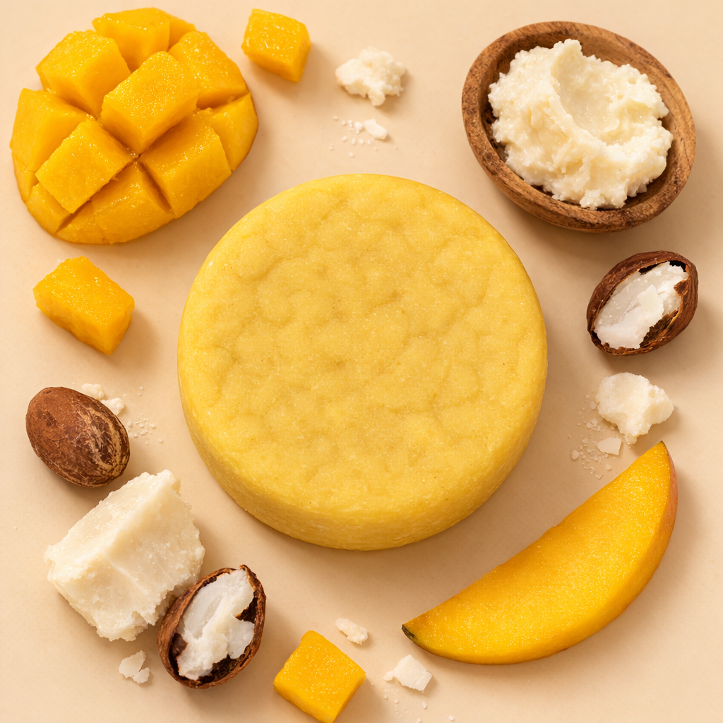 Ingredients: SCI, Oat Powder, Cocoa Butter, Cetyl Alcohol, Shea Butter, Mango Butter, Coconut Oil, Mango Extract, Cocamidopropyl Betaine, Calendula Extract, Panthenol, Vitamin E, Phthalate-Free Fragrance, Natural Preservative, Natural Colorant.